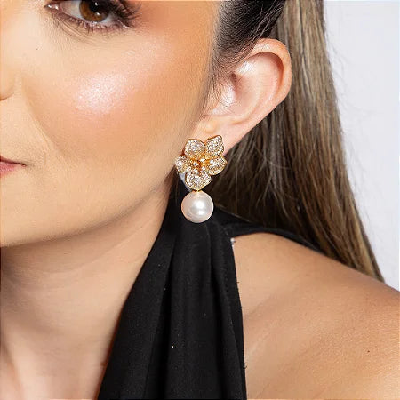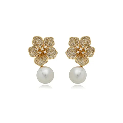 Plaqué or 18 carats Boucle d'oreille en perles Shell serties de cristaux de zircone Hauteur : 40 mm