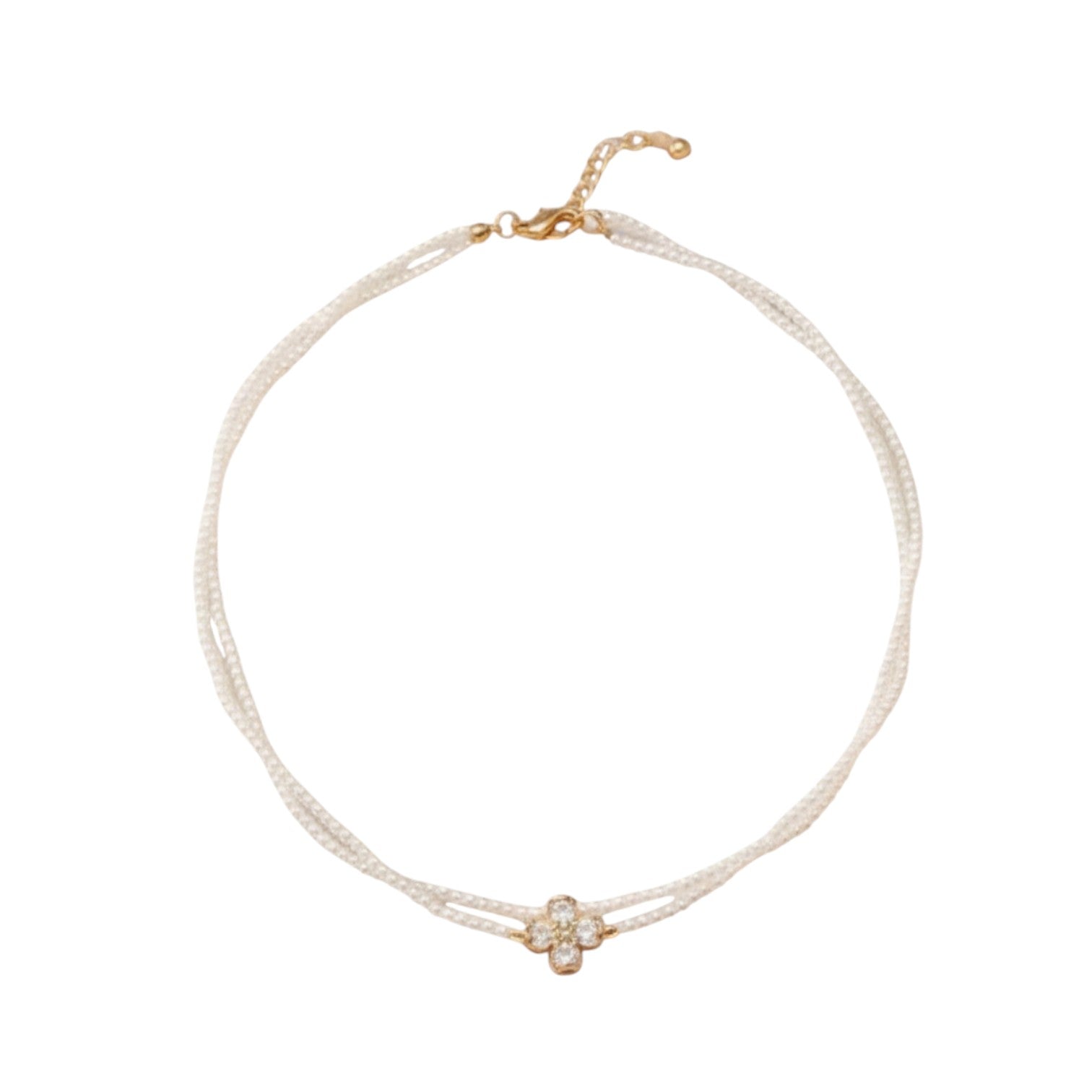 Celebrating feminine delicacy, the Jasmine Pearl Necklace features a double row of miniature shell pearls, centered by a white floral motif set with a carefully placed green zirconia. Its refined design, finished with a subtle lacquer, graces the neckline with a fitted chain and 5 cm extension.