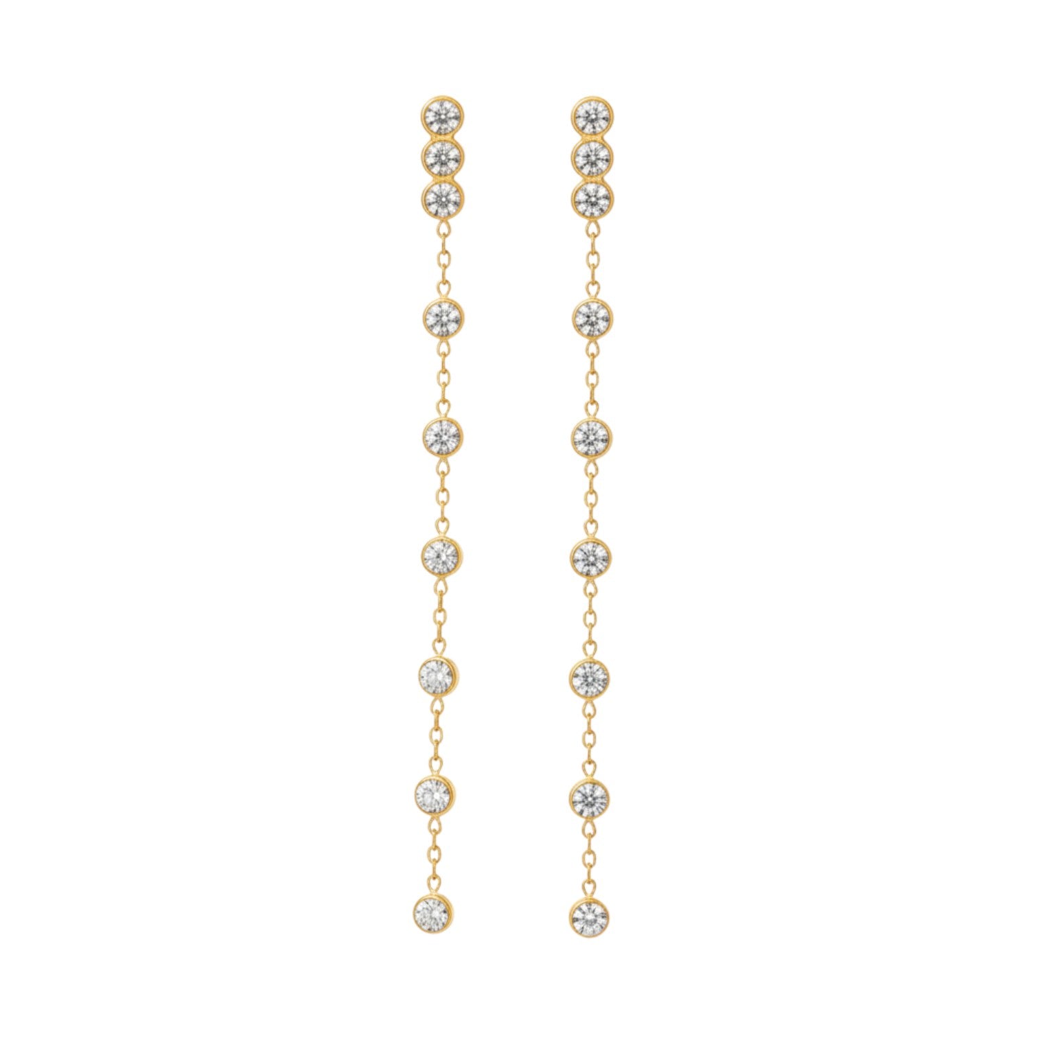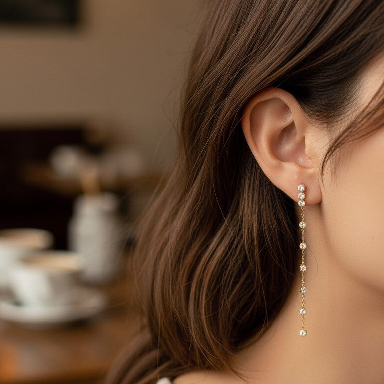 These long, luminous earrings draw the light into a delicate chain of crystal-bright zircons, each stone softly framed in warm gold. Their slender silhouette sways with an almost liquid grace, creating a refined glimmer that elongates the neckline and adds effortless sophistication to evening or everyday looks.